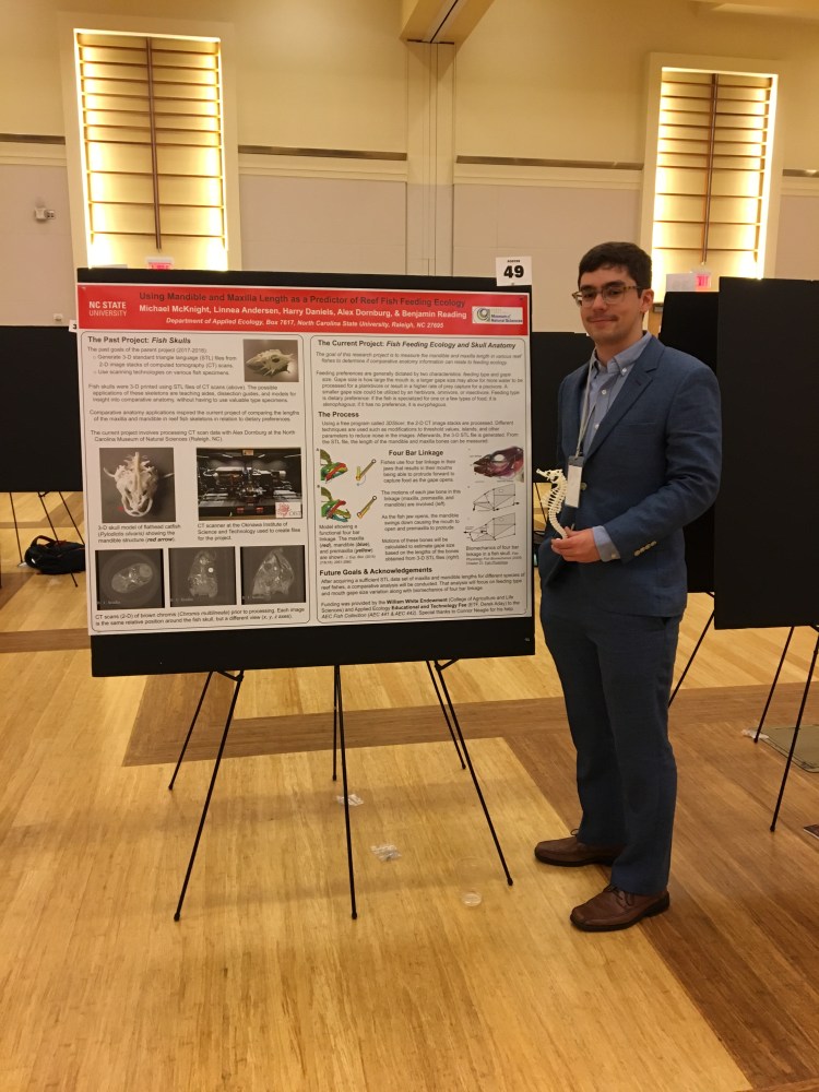 McKnight, M., Andersen, L.K., Daniels, H.V., Dornburg, A., and Reading, B.J. 2019. Using Mandible and Maxilla Length as a Predictor of Reef Fish Feeding Ecology. The 28th Annual North Carolina State University Spring Undergraduate Research + Creativity Symposium. April 24. Raleigh, NC, USA. Poster.